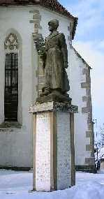 před věží kostela byl v roce 1933 umístěn památník obětem l. světové války. Na žulovém podstavci je socha Legionář, jejíž autorkou je akademická sochařka Karla Vobišová - Žáková (1887-1961), kunžacká rodačka.